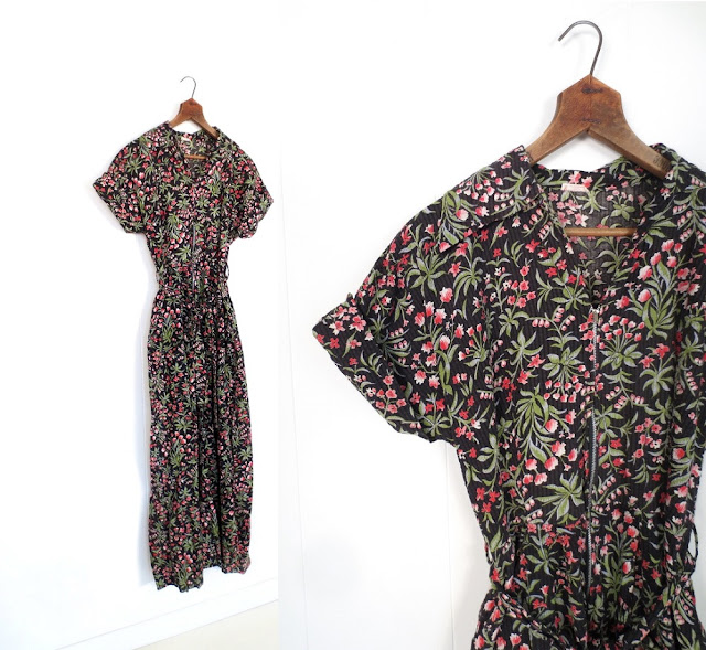 1950s rose and peony print shirtwaist dress, with flower buttons.