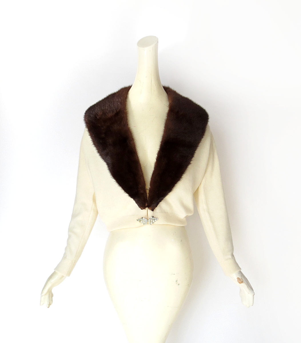 1950s pale pink wool cardigan with rhinestones, floral embroidery, and faux pearls, Kims by Kimberly Knitwear.